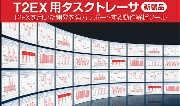「T2EX用タスクトレーサ」は、「T-Kernel用タスクトレーサ」を大幅に機能拡張し、T-Kernel 2.0の最新ミドルウェア「T2EX」にも対応させたものです。本製品の利用により、T2EXを用いた組込みシステムのプログラムを動作させたままで、実行タスクの遷移やシステムコール発行のログを記録し、その様子をグラフでビジュアルに表示できます。