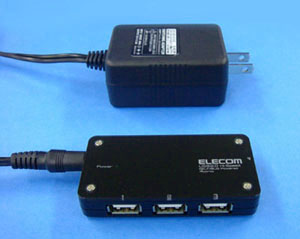 - USB機器に5Vの電源を供給するため、ACアダプタ付きのUSBハブを使用します。